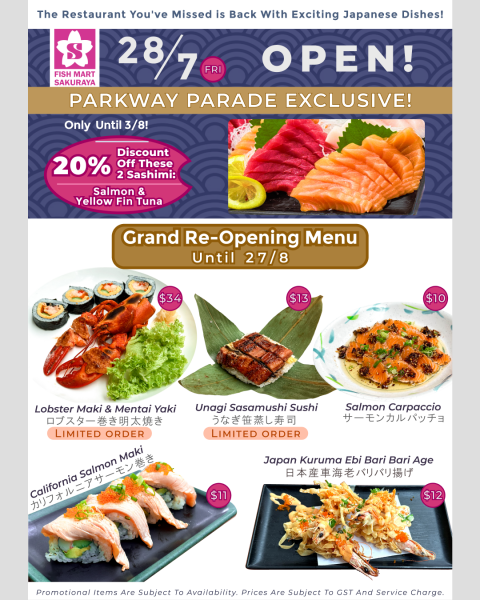 営業再開の記念としてパークウェイパレード店だけがこの一週間、28/7から~3/8まで、サーモンとマグロ刺身が20%の割引があります!