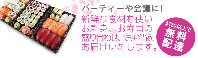 お引き取りは店頭のほか、合計金額$120 以上ご注文のお客様にはお寿司、お弁当の配達を承ります。(配送料無料)$120未満のご注文は、配送料一律$20で配送いたします。日曜日の配達は5pm~7pmの時間帯のみ配達が可能です。土曜、日曜の配達には週末料金が別途$10かかります。祝日の配達はございません。